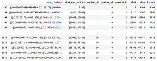 Figure 7 illustrates detailed information about the sEMG data, including column information. It consists of five columns. Column 1 contains information about the 2-channel sEMG data. Column 2 provides start and end indices related to sampling information. Column 3 contains subject ID details for the performed gesture, while Column 4 indicates the gesture number performed by the subject. Finally, Column 5 contains session IDs and details for the three sessions. This comprehensive dataset provides a robust foundation for further analysis and exploration of gesture identification using sEMG signals.