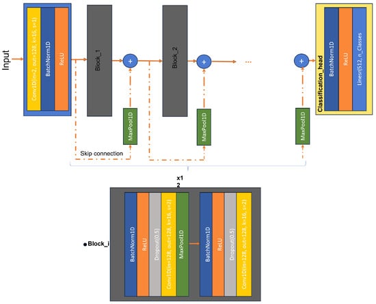 Figure 9 illustrates the employed residual neural network (ResNet-1D) for personal identification. The complete structure consists of 12 stacked blocks with skip connections, and a classification head is attached to predict the class label. The arrangement of layers within any Block_i in the residual network is also depicted. This combination of layers enhances the network’s performance and facilitates effective training on 1D data.