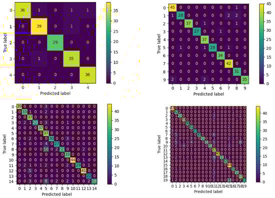 For a more detailed analysis of the model’s performance, we present the confusion matrix for each case of 5, 10, 15, and 20 subjects, respectively, as shown in the Figure 10. The confusion matrix provides a comprehensive visualization of the model’s classification results, illustrating the distribution of true and predicted labels for each individual. In the confusion matrix, the rows represent the true labels (actual identities of individuals), while the columns represent the predicted labels (model’s identification results). Each entry in the matrix shows the count of instances where a true label corresponds to a specific predicted label. By analyzing the confusion matrices and corresponding graphs, we gain valuable insights into the model’s ability to correctly identify individuals and identify potential misclassifications. The visual representation allows us to observe patterns of correct and incorrect predictions, understand any biases or imbalances in the dataset, and assess the model’s overall performance for personal identification across different subject cases.
