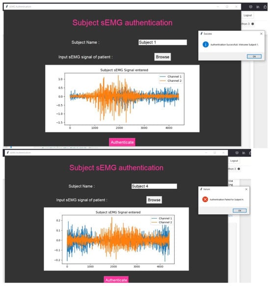 The web application was specifically designed for the sEMG authentication process as depicted in the Figure 13. During the authentication process, the system verifies whether the sEMG signal corresponds to the same or a different subject. If the sEMG signal does not match the profile of the designated subject, the authentication process fails.