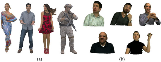 Figure 3. Point cloud datasets. (a) MPEG 3DG point clouds. Their first frames are shown from left to right: L o n g d r e s s , L o o t , R e d a n d b l a c k , and S o l d i e r . (b) JPEG Pleno point clouds. Their first frames are shown from left to right: A n d r e w , D a v i d , P h i l , R i c a r d o , and S a r a h .