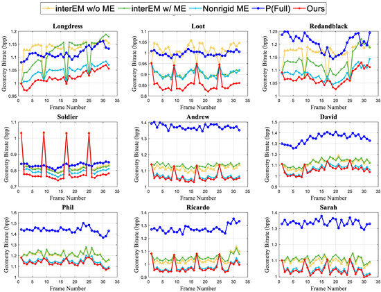 Moreover, the experiments highlight the efficacy of the proposed affine ME scheme in enhancing the motion model’s capability to capture intricate motions within point cloud sequences. As illustrated in Table 2, our ME scheme consistently outperforms the Nonrigid ME scheme across all tests, achieving an average 1.77% geometry bitrate gain. The Nonrigid ME scheme is our previous work on dynamic point cloud compression, which introduces a nonrigid motion model with 16 parameters to capture point cloud complex motions. Our proposed affine ME scheme devises an affine motion model with an enhanced patch-based motion representation that can better depict the motion field in dynamic point clouds. With only 12 model parameters, our affine motion model requires four fewer parameters to be encoded into the bitstream compared to the Nonrigid ME scheme. Moreover, Figure 4 presents the frame-wise compression performance of the proposed scheme and comparative platforms. Substantial and consistent geometry bitrate gains are obtained by the proposed scheme across all tests, which validate the effectiveness and robustness of the proposed scheme for compressing dynamic point clouds with diverse motion features. Moreover, there are some peaks in geometry bitrate in Figure 4, which are attributed to the GOP parameter. We adopt the IPPP coding structure with GOP = 8, where the first frame in a GOP serves as the I frame, while the subsequent frames in the GOP are P frames that utilize the previously decoded frame as the inter reference for inter prediction and coding. Generally, the geometry bitrate in I frames tends to be larger than that in P frames, resulting in the observed geometry bitrate peaks in Figure 4.