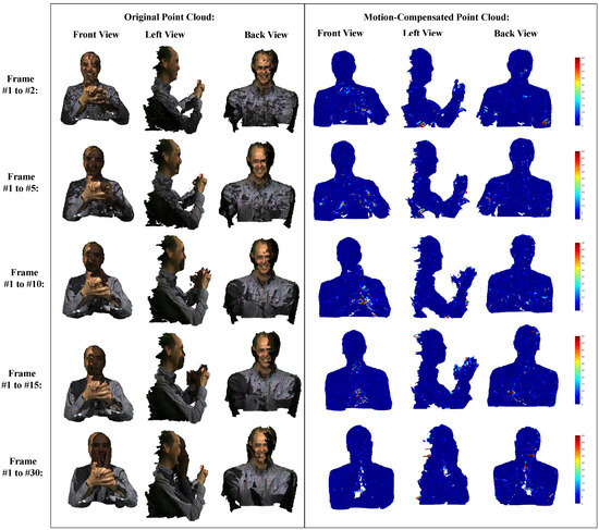 Let F ( t ) be the decoded frame at time index t, it comprises n points v 1 , v 2 , , v n R 3 . Let F ( t 1 ) denote the previous frame relative to the current frame, it contains m points u 1 , u 2 , , u m R 3 . The objective of motion analysis is to track motions by identifying geometric changes between consecutive frames. Motion vectors are computed by establishing correspondences between points at time t and points at time t 1 . The nearest neighbor search method with the Euclidean distance metric is adopted to find point correspondences. Specifically, a KD-tree search is employed for efficient nearest neighbor search to mitigate computational complexity. Then, the matched point u m a p ( i ) in frame F ( t 1 ) for point v i in frame F ( t ) is determined, along with the estimated motion vector m v ( i ) via the following optimization process: