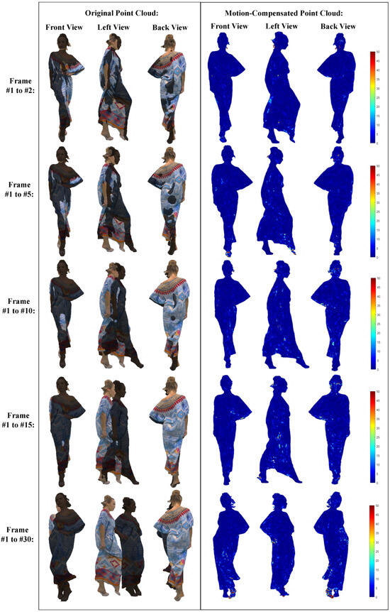 Additionally, Figure 5 and Figure 6 present the reconstruction quality of motion-compensated point clouds generated by our scheme at different frame rate settings on Phil and Longdress, respectively. Each row within the figures showcases original point clouds at two frame indices alongside motion-compensated point clouds from three different perspectives (front, left, and back). We also visualize the mean square error of the geometry distortion between the original and motion-compensated point clouds with error color-coding maps. The experimental results verify the ability of our scheme to generate high-quality motion-compensated point clouds across diverse datasets characterized by distinct noise levels. In our paper, the GOP parameter is not manually tuned but empirically set, according to the commonly adopted GOP = 8 in video coding tests. It is crucial to highlight that our scheme utilizes the IPPP coding structure without B frames. Consequently, variations in the GOP settings do not exert a significant influence on the motion estimation performance of our scheme. Moreover, our proposed forward-backward joint motion estimation approach distinguishes itself from bidirectional prediction methods. Unlike bidirectional prediction methods that necessitate referencing both the previous and subsequent frames, our scheme exclusively utilizes the previous frame as a reference. This design enables our scheme to consistently deliver optimal performance across different GOP settings, thereby ensuring robustness and stability in various coding scenarios.