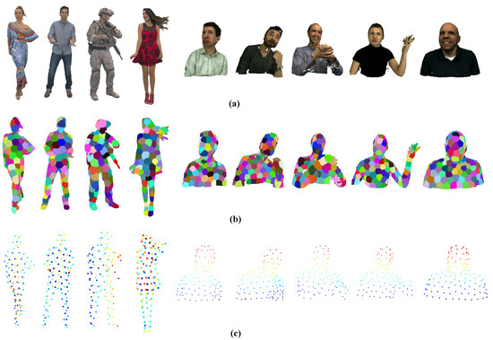 where k is the number of patches, g ( j ) is the number of points in the patch P j , and p i is a point within the patch P j . The motion m v ( p i ) of point p i is derived from the estimated motion field described in Equation (6). The motion m v ( μ j ) is approximated by the motion of the centroid’s nearest neighbor points. The centroid μ j of the patch P j is computed as