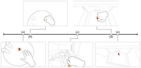 An example video timeline for user study 1. The white dots represent the video frames when creating different playback starting points. (a) The stamp is the target object for this example video. (b) OG playback starting point: This frame shows that object was grabbed by user. (c) DA playback starting point: This frame displays the container entering the camera’s field of view. (d) OR playback starting point: This frame shows that the object is being placed down at the destination. (e) The last appearance of the target object marks the end of the playback.