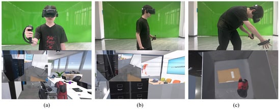 (a) The participant pressed the controller trigger and the video playback visual cue appeared. (b) Guided by the video playback visual cue, the participant approached the target object location. (c) The participant grabbed the target object.