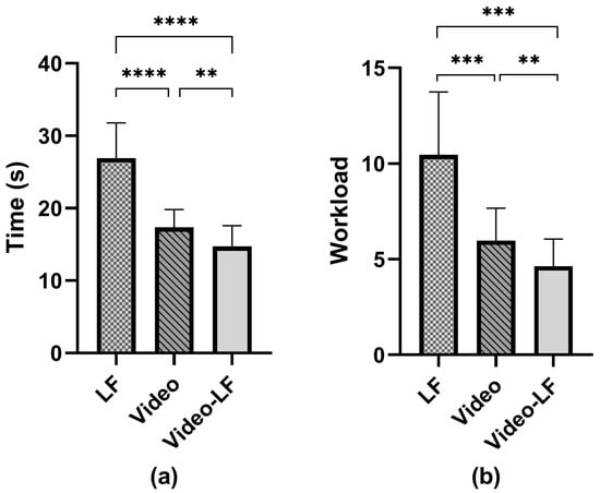 Workload. We found a significant difference ( = 30.471, ) among the three conditions. The workload score under the video-LF method (M = 4.6, SD = 1.4) was significantly lower than the video (M = 6.0, SD = 1.7, Z = , ) and LF (M = 10.6, SD = 3.2, Z = , ) methods. The workload under the LF method was significantly higher than the video method (Z = , ).
