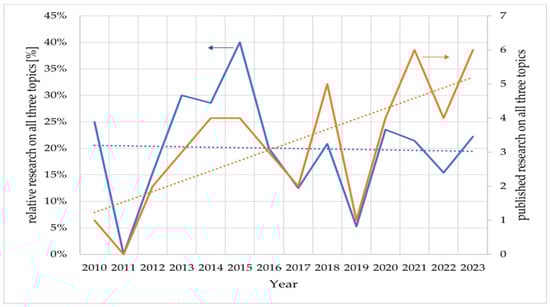 Literature research on “ammonia AND e-nose AND environment” relative to “ammonia AND e-nose” (blue). Absolute literature research on “ammonia AND e-nose AND environment” (orange). The blue and orange dotted lines are the linear fit of the relative research and the published research on those topics, respectively.