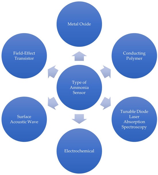 A prior review of ammonia sensors has shown examples of different types of sensors that have been developed [], and all of them are indicated in Figure 2. To infer about the sensing mechanisms associated with these sensors, one can summarize the following: