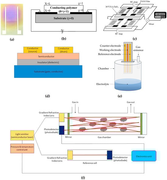 Layouts of different sensors used for ammonia gas detection: (a) Metal oxide reprinted from Ref. []; (b) conducting polymers reprinted from Ref. []; (c) SAW reprinted from Ref. []; (d) FET reprinted from Ref. []; (e) electrochemical; and (f) TDLAS reprinted from Ref. [].