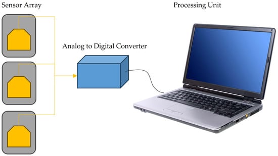 Schematic representation of an e-nose system, which consists of an array of sensors and one or more measuring system(s) with an analog-to-digital converter connected to a computer or a cellular phone for data treatment and data comparison.