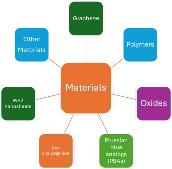 All the results and circumstances described above suggest that the best solution for achieving better results in ammonia detection is through the development of e-noses. This solution is also defended by []. An e-nose consists of an array of specific or non-specific sensors used to mimic human senses—see [] and references therein—and then distinguish VOCs from the electrical signals, such as resistance, capacitance, and impedance, among others, which can be measured using changes in concentration that take place because of interactions of a sensing material with a gas sample, as illustrated in Figure 4. The literature described above reveals that adequate molecules/layers can detect ammonia molecules. Therefore, to detect ammonia, one should prepare sensors with sensing layers consisting of oxides (Ca-doped ZnO nanoparticles [], indium oxide (In2O3:La) [], Mo-doped (doped at different concentrations) Bi-VO4 [], zinc oxide and cobalt-doped ZnO []); polymers (polyaniline (PANI) [,], P-BNT []; poly[benzimidazole-benzo-phenanthroline] (n-BBL) []); iron chalcogenide []; Prussian blue analogs (PBAs) []; 4-phenyl-1,8-naphthalimide (NMI) []; WS2 nanosheets []; and blends as ZnO/rGO [], among others. The scheme shown in Figure 5 summarizes the materials adequate for detecting ammonia and which could be used in the development of e-noses.