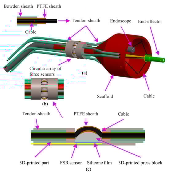 The scaffold is attached to an endoscope. Since this study is focused on cable tension sensing, we use a 3D-printed rigid scaffold to validate the sensor design. The driving mechanism, a tendon–sheath system, is composed of a Bowden tube, a PTFE tube to reduce friction, and a cable. In Figure 1b, a circular sensor array, equipped with six FSR sensors, shown in Figure 1c, is mounted near the scaffold to measure cable tension. Figure 2 shows an example of a CDPR configuration where the bending angle will change as the end-effector moves.