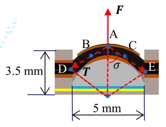 In this context, denotes the reaction force resulting from the cable’s pressure. The tension is represented by the line segments AE and AD, with point A being the force application point, and points B and C serving as the tangent points between the tension and the arc. The angle is the angle formed between the tension and the vertical line. The relationship between and is influenced by the dimensions (such as and height) of the press block and the 3D-printed part. Equation (1) shows an ideal relationship regarding the geometric dimensions, while the actual relationship between and will be measured and derived based on experimental data as follows.