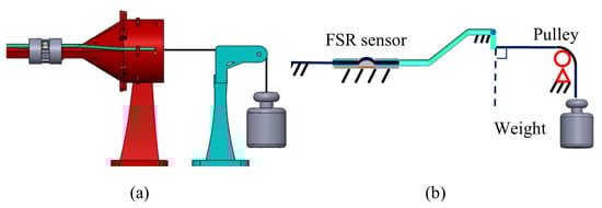 Single cable test platforms. (a) FSR sensor at the distal end; (b) strain gauge at the proximal end.