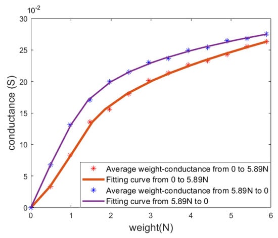 Figure 7 depicts the correlation between the measured sensor readings (conductance) and the tension of a single sensor during the loading and unloading of the weights, while the fitted curves are obtained by quintic polynomial fitting: