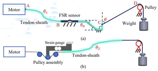 To illustrate the tension estimation difference between measurements at the proximal and distal ends, this test takes place in two scenarios: one where the FSR sensor is placed at the robot’s distal end with the platform in Figure 8a, and the other where a strain gauge is positioned at the proximal (motor) end with the platform in Figure 8b, both with identical cable bending angles where . Before the test, the sensor is pre-tensioned with weights, and then the motor is set to move back and forth, while the cable tension is recorded either at the distal end by the FSR or at the proximal end by the strain gauge. During the motor motion, the weight remains constant; thus, the recorded force change is primarily due to the friction between the moving cables and their sheath. Therefore, the experiment highlights the extent to which the two setups depicted in Figure 8 are affected by friction.