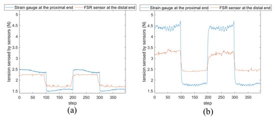 Figure 9 shows the comparison of perceived force changes. In Figure 9a, with a cable bending angle of 0° and a pre-tension of 1.96 N (i.e., 200 g weight from the pulley), the FSR sensor at the distal end registers a change of 0.54 N (from 2.25 N to 1.71 N), while the strain gauge at the proximal end records a change of 0.98 N (from 2.48 N to 1.50 N). In Figure 9b, where the cable bending angle is 30° and the pre-tension is 2.94 N (300 g weight at pulley), the FSR sensor at the distal end shows a change of 0.93 N (from 3.32 N to 2.39 N), while the strain gauge at the proximal end indicates a change of 2.69 N (from 4.43 N to 1.74 N).