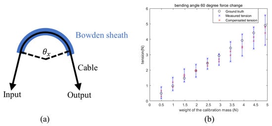The results in Figure 10b were collected by varying the tension (weight of the calibration mass) from 0.49 N to 4.9 N (equivalent to a weight range of 50–500 g) for a 60° bending angle . For each tension, the motor moved forward and backward three times. In other words, by varying the weights and conducting repeated experiments, graphs similar to Figure 9 were obtained, while Figure 10b resulted from statistically analyzing all their variation ranges. Figure 10b demonstrates the results that compare the sensor’s reading changes without compensation and after compensation using the Capstan equation.