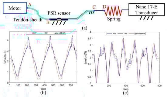 The second test verifies the force compensation effect of a single cable, as shown in Figure 11. Figure 11a shows the test platform, with segments BC and CD having the same size and bending angle as the tendon–sheath assembly of the actual robot. The cable starts from the motor side, passes through the FSR sensor, and is linked to a spring connected to a Nano 17-E Force/Torque Transducer (F/T sensor). The cable pulls the spring over different distances to generate different cable tensions. Subsequently, the motor moves at variable speed to pull the cable and spring. Throughout this process, the F/T sensor captures the ground truth of tension variations. The modelled tension is calculated using the Capstan equation. Figure 11b,c show a comparison between the measured tension and the ground truth when the AB segment in Figure 11a bends 360° and 180°. Figure 11b,c indicate the following: