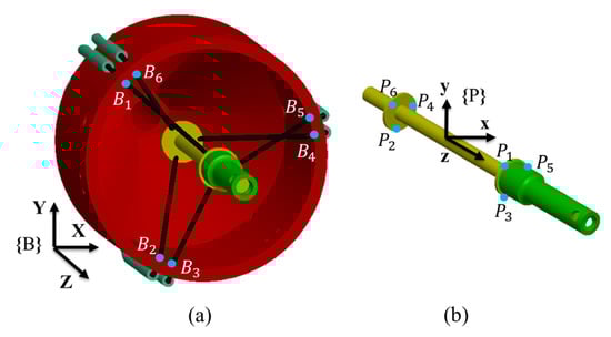 Frames of {B} and {P}. (a) Frame {B} on the scaffold. (b) Frame {P} on the end-effector.
