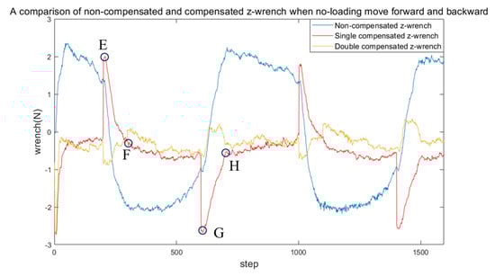 In Figure 13, the EF and GH segments represent the sections that undergo a degree of compensation during the forward and backward movements, respectively. Polynomial fitting is utilized to fit the EF and GH segments, to compensate for abrupt changes in the sensed external force during end-effector direction changes. The variation in the sensed external force (without payload) is illustrated as the effector oscillates in 20 mm distance twice along the z-axis at an approximate speed of 0.5 mm/s. The graph presents three scenarios: without any compensation, with single compensation, and with double compensation applied by the compensation strategy.