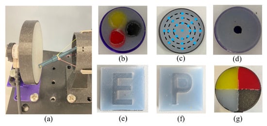 Silicone pads used for palpation with 6 mm thickness. (a) The setup for the palpation test. (b–g) The silicone pads used for different palpation tests. Size: (b) 27 mm diameter; (c,g) 60 mm diameter; (d) 27 mm diameter with an 8 mm diameter hole in the middle; (e,f) 30 × 30 mm.