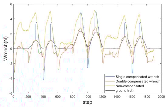 As depicted by the blue line in Figure 13, without any compensation, the sensor readings exhibit instability during no-load motion. After applying the first round of compensation, a sudden change in the reading is observed upon turning, although the readings remain stable in other areas. When a second round of compensation is applied, the abrupt change observed during turning is diminished, resulting in stable readings throughout the movement.