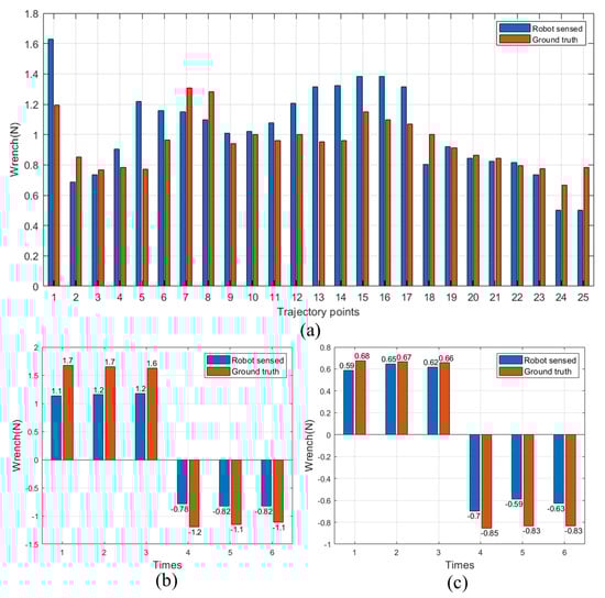 In Figure 14d, the silicone pad designed for evaluating wrench performance along the x and y axes is depicted. The robotic system engages with the silicone pad by inserting the effector’s end into the hole in the middle to make contact with the pad three times in both positive and negative directions along the x and y axes. Figure 16b,c present the outcomes obtained when the tip of the effector moves along the x and y axes. The measurement results are extracted from the deepest points along the x and y axes. The average error is calculated to be 0.268 N, with a root-mean-square error of 0.321 N.