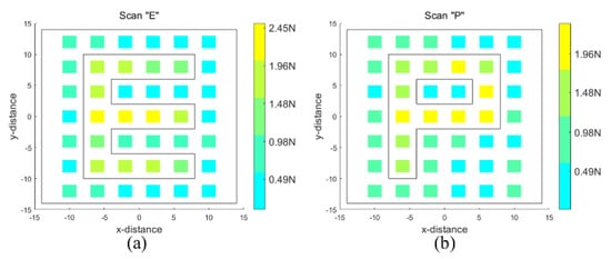 Figure 14e,f show the letters used for scanning. The rigid letter pattern is covered with silicone. The robot scanned an array of 6 × 7 points with the end-effector poked 5 mm deep. Figure 17a,b combine the external wrench sensed by the robot at each point to reconstruct the letters “E” and “P”. It shows the relative position of the poked points and the scanned letters “E” and “P”, as well as the reconstructed image represented by color gradients. The scanning results indicate that the robot is able to distinguish between rigid letter patterns and soft silicone, demonstrating the ability of the robot to also sense through palpation tumors hidden under the tissue surface.
