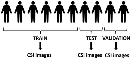 The authors [] have not dedicated a separate section or paragraph on dataset partition in their paper. However, they claimed an exceptional accuracy rate of 99%. In the experimental results, we empirically corroborate that the authors divided the dataset in their methodology without respect to individual subjects, a crucial oversight that undermines the integrity of the study. By neglecting to divide the dataset with respect to the individuals, the authors inadvertently introduced a significant source of data leakage. The absence of subject-based data partitioning in the training, validation, and test sets raises concerns regarding the potential overlap of CSI images originating from the same individual across these sets. This oversight introduces a significant risk of data leakage, as CSI samples from a given individual may inadvertently influence the training process and subsequently inflate the reported accuracy metrics. Without a systematic approach to ensure the exclusivity of subjects across the dataset partitions, the study’s findings are susceptible to biases and inaccuracies, undermining the credibility of the proposed methodology. For clarity, Figure 3 and Figure 4 illustrate the differences between dataset partitioning with respect to and without respect to humans, respectively. As depicted in Figure 3, partitioning with respect to humans ensures the exclusivity of subjects across training, validation, and test sets, avoiding the risk of data leakage. In contrast, Figure 4 demonstrates the dataset division without respect to humans. In this incorrect strategy, CSI images are generated first (the exact number of CSI channels available in a Wi-Fi system may vary depending on the specific implementation and hardware capabilities []. Subsequently, these CSI images are randomly divided into training, validation, and test sets. As a consequence, samples from one human can very easily occur both in the training and test sets leading to data leakage. Why does dataset partition without respect to humans cause data leakage? Let us consider a scenario where we develop a product for WiFi-based human action recognition and intend to sell it to a market in another country. In this new market, the demographic composition, cultural norms, and individual identities will undoubtedly differ from those in our local setting. If our model is trained without proper consideration for subject-based partitioning, it may inadvertently learn patterns specific to the individuals in our local dataset. Consequently, when deployed in a different country where the population characteristics vary, the model’s performance may degrade significantly. By partitioning the data with respect to humans, we ensure that the model learns generalizable patterns of human actions rather than relying on idiosyncratic features of specific individuals. This approach not only enhances the model’s adaptability to diverse populations but also promotes its robustness and reliability across different cultural contexts.