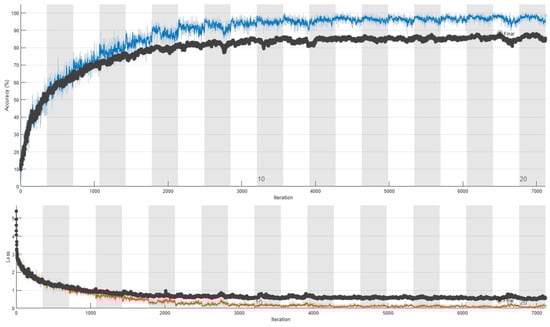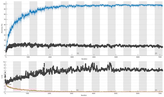 The training curves of ResNet18’s retraining without respect to humans and with respect to humans are depicted in Figure 5 and Figure 6, respectively. These figures allow interesting conclusions. When the data split is conducted without respect to humans, we observe a strong correlation between training and validation accuracy, with validation accuracy closely tracking the trends of training accuracy albeit with a small difference. This consistency suggests that the model is effectively learning from the training data and generalizing well to unseen validation data. Conversely, when the data split is performed with respect to humans, a notable disparity emerges between training and validation accuracy. Despite a consistent increase in training accuracy, validation accuracy exhibits saturation, indicating that the model’s performance fails to generalize to unseen data effectively. This discrepancy suggests that the model may be overfitting to the training data when subjected to subject-based data partitioning, emphasizing the importance of proper data management practices to ensure model robustness and generalizability. The stark contrast in the behavior of training and validation accuracy highlights the critical role of data partitioning methodology in evaluating model performance accurately. These findings underscore the necessity of subject-based data partitioning to obtain reliable estimates of model generalization and mitigate the risks of overfitting.