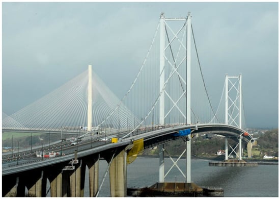 From 2005, the corresponding author of this paper participated in, and then led, a series of episodic monitoring campaigns on one of the longest bridges in the UK, the Forth Road Bridge in Scotland [27]. With support mainly from the European Space Agency (ESA), a phased installation of a permanent monitoring system called GeoSHM started from 2014 [9]. The Forth Road Bridge was opened to traffic on 4 Sept 1964. The total length of the bridge is 2.5 km, with a main span of 1006 m (Figure 1). It was the world’s longest bridge outside the US, but now it ranks at number 44. The Forth Road Bridge is essential for the Scottish/UK economy. According to the former bridge master, closing one of its four lanes per day will cost GBP 650 K. The structural responses are dominated by temperature and traffic loadings and the bridge is susceptible to wind effects which cause excessive lateral movement and predicted over-stress under design wind loading. Regular repairs to the main components were carried out during its service lifetime of 58 years (https://www.theforthbridges.org/about-the-forth-bridges/forth-road-bridge/forth-road-bridge-maintenance/, accessed on 11 May 2024).