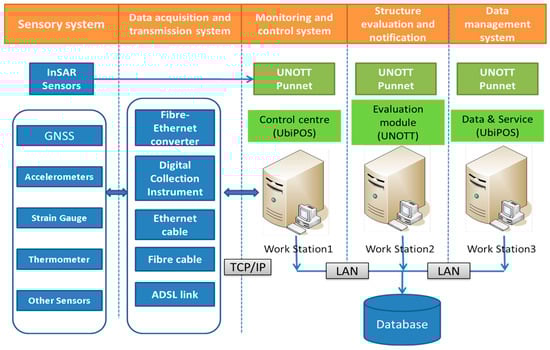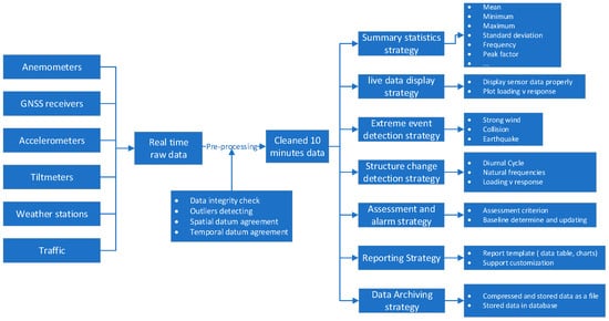- The data receiving and management software module. This is used for data receiving, cleaning, and pre-processing and for storing relevant statistical data and original observation measurements according to the designed SHM data strategy.