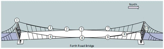 The sensor locations on the Forth Road Bridge (refer to Table 1 for the meaning of numbers).