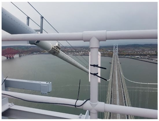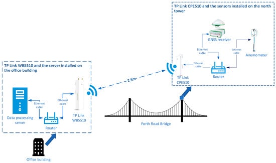 When the optical fiber connection failed to transmit data due to the installation challenge and long transmission range limitation for a remote monitoring node in the GeoSHM project, a wireless communication method was tried. It turned out to be a very reliable and cost-effective solution. Therefore, the communication network used in the GeoSHM project is a combination of an optical fiber for most sensory sites and paired long-range Wi-Fi devices for a remote northeast (NE) supporting tower site. The NE monitoring node is the furthest point in the whole GeoSHM system and consists of a GNSS receiver, an anemometer, and a triaxial accelerometer. Figure 4 is the wireless communication set up of SHM5, which sits atop the NE tower of the Forth Road Bridge.