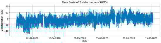 Figure 6 is the time series of the SHM5 vertical movement and an almost 100% transmission rate was achieved in the three-month period from March to June 2020 during the peak of the COVID-19 pandemic, which reflects the reliability of wireless communication for SHM. Additionally, it is noted that the transmission entails a time delay of approximately 10 ms, but the latency depends on various factors such as network conditions, distance between devices, and interference. The negligible data packet loss rate also indicates a stable signal.