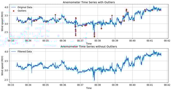Figure 8 illustrates the GNSS time series plot comparing the original data set with the outlier-removed data, focusing on the Y-axis direction at the mid-span, where the sensor ID is SHM2. Meanwhile, Figure 9 showcases the time series plot derived from data captured by the ANE2 anemometer, positioned atop the north tower.