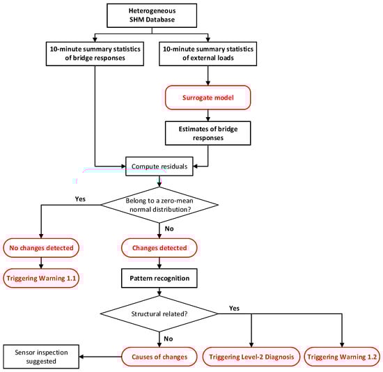 Sub-modules (i) and (ii) create additional data and fundamental models which will be utilized in subsequent sub-modules to diagnose the health status of the bridge; Figure 11 and Figure 12 show the flowcharts of the sub-modules (i) and (ii).