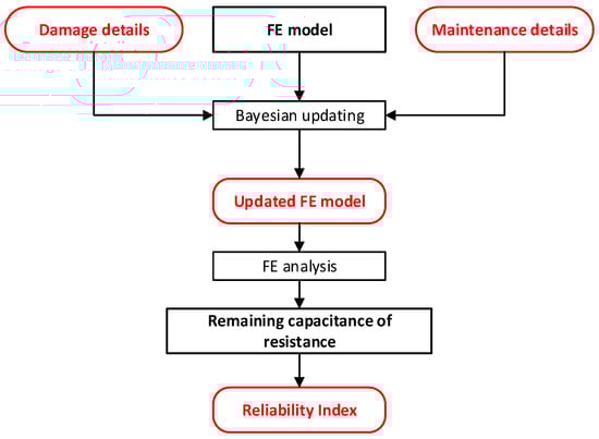 Sub-module (v) is level 3 diagnosis for reliability assessment, which leverages a FE model, damage details, and maintenance records to assess the reliability index of a bridge. Initially, the damage or maintenance specifics obtained from Sub-module (iv) are employed to update the FE model using a Bayesian updating framework. Subsequently, an FE analysis is conducted on the updated model to evaluate the residual resistance capacity of the bridge. This evaluation is then translated into a reliability index by comparing it against the current loading conditions and stress levels on critical bridge members. The effectiveness of this sub-module is contingent on the availability of accurate and timely damage and maintenance details. See Figure 15.