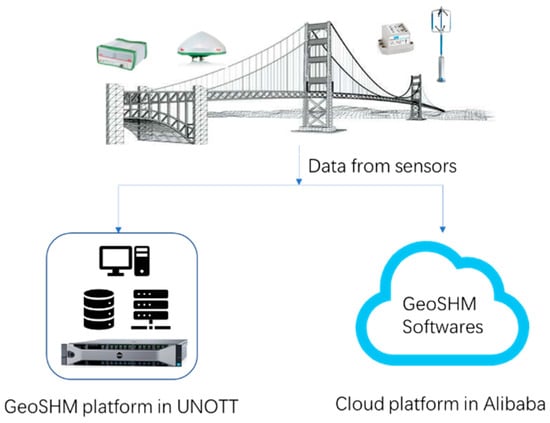 - Data processing and analysis management software modules. This is used for estimating the SHM parameters and model update driven by AI, the dynamic adjustment of thresholds, the real-time health assessment of bridge structures, and warning services.