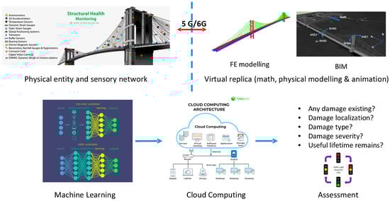 In the SHM of bridges, a digital twin intends to build a virtual model that uses the real-world heterogenous data sets gathered from an operational bridge as its input for enhancing asset management process. Once precisely constructed, the DT can be used to simulate and predict the possible impacts of certain environmental and loading effects using monitoring data sets as the DT inputs. Linking the DT and artificial intelligence, especially using deep learning and transfer learning, is essential and a current development trend in implementing smarter, safer, and higher-quality infrastructure inspection regimes (Figure 17).