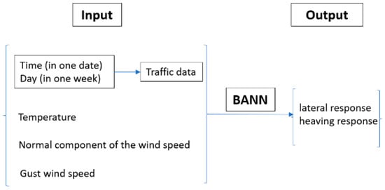 The last character is extremely important, since sensors on the structures bear errors or outliers which are detrimental to the success of structural condition assessments. In the GeoSHM data analytics toolbox, a BANN is employed to generate a non-linear regression model to estimate time-dependent lateral and heaving responses with respect to variations in wind, temperature, and traffic. The inputs and outputs of the regression model are 10 min average statistics and the use of the BANN for monitoring data analysis is described in Figure 18.