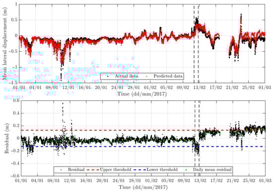 Empowered by the BANN, a new rolling assessment and updating approach has been developed for the GeoSHM project to detect structural changes in the Forth Road Bridge, as shown in Figure 19. The first row in this figure is a time series comparison between the measured mean lateral movements and those predicted using the BANN. The second row includes the difference in the two time series in the comparison (called residual), the upper and lower thresholds determined using at least one year’s monitoring data (loading and response), and the daily mean residual, which is used to assess the structural changes. It is apparent that, after 13 February 2017, the daily means are either close to or moved out of the set thresholds. A further investigation reveals that, on this date, the maintenance team had completed the truss end link repair at the northeast main span, which changed the dynamic characteristics of the bridge (https://www.theforthbridges.org/news-and-blogs-from-the-forth-bridges/truss-end-links-repair-one-year-on/, accessed on 11 May 2024).