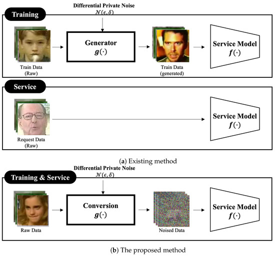 Figure 1b shows a simplified architecture of the proposed differential private image generation method. The proposed method consists of two components; i.e., Conversion and Service Model . The Conversion component transforms the input image into a noised format, preserving machine-readability, while obscuring the image from human recognition, and the Service Model component conducts training and analysis tasks on the converted, noised image.