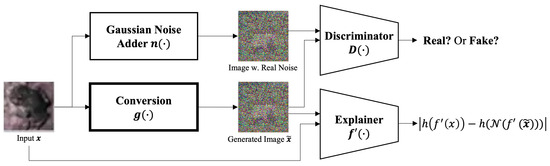 where ∘ is the composition of functions, is a generator, which is the Conversion component, and D is a discriminator. In Equation (1), the term means the distance between the explain map of the original data and the explain map of the converted data with differential private noise. Here, the loss function of the discriminator is the same as that of the original GAN’s discriminator, except that the distribution of the discriminator’s input is changed from the original images to noised images. Contrarily, the loss function of the generator is defined as a joint loss consisting of noise loss and explanation loss.