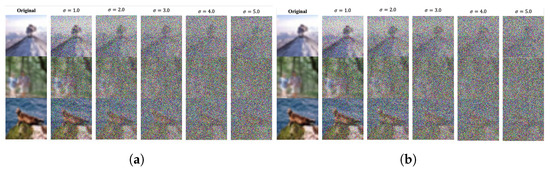 Comparison of noised images with Gaussian noise and converted images using the proposed scheme. (a) Noised images with Gaussian noise with a target value; (b) Converted images using the proposed scheme with a target value ().