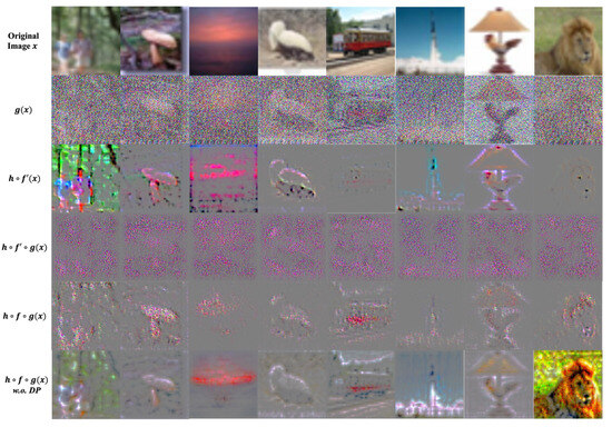 Input data modification strategies, such as marginal distribution (MD)-based techniques [23,24], offer an alternative. While effective for structured tabular data, their application is limited in this domain. Generative adversarial networks (GANs) [25,26,27] can address both structured and unstructured (e.g., image) data, but their success has been primarily confined to simple datasets like MNIST. Instance-hiding based methods [28] have shown good performance for accuracy on various datasets. However, they can be applied in the training phase only. Thus, such methods cannot be applied to protect a client’s data privacy.