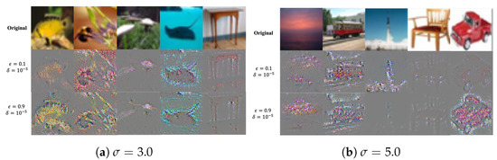 Considering Equation (3), the explanation map of and should have become similar as the model shows better performance. However, the explanation maps of in the fourth row only shows very strange images that do not match with the corresponding explanation map in the third row. In addition, the explanation map of and show different shapes with proper privacy parameter settings. However, the experimental results in Section 5.2 show a clear performance difference using . Additionally, compared to the last row, which shows almost all details, the explanation maps in the fifth row hide details of the object very well. As a consequence of such observations, we conjecture that the explanation loss preserves machine-recognizable features that are not human-unrecognizable, even in the presence of noise from DP.